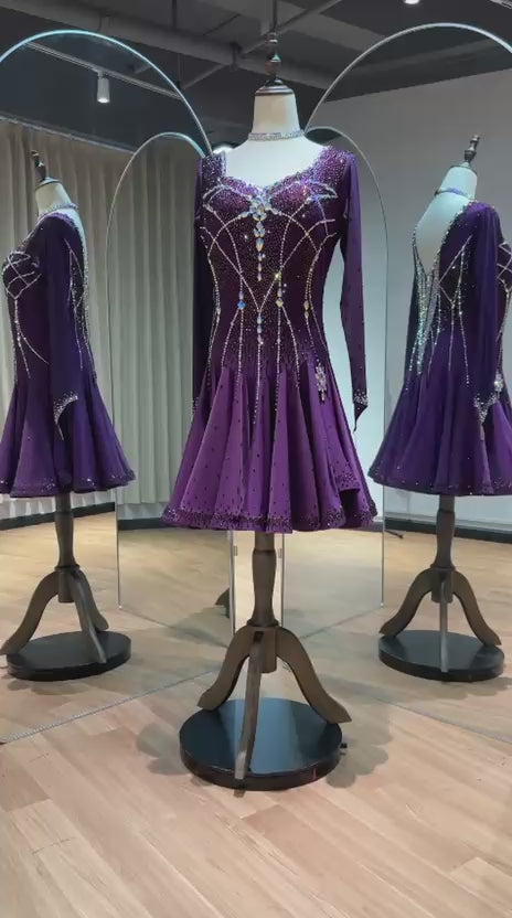 62L Plum Competition Latin Dance Dress. Mega full skirt for maximum movement. Stoned in AB & Amethyst. High back for wearing own Bra option. ❤️Showroom Appointments Available❤️