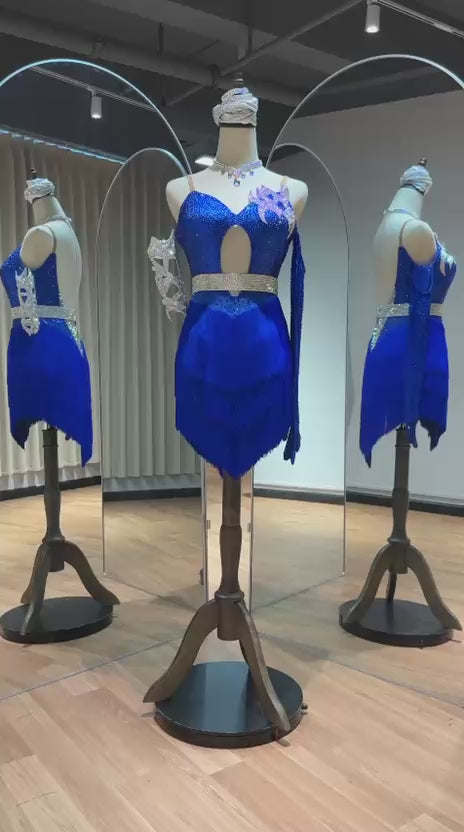 63L Cobalt Blue Competition Latin Dance Dress. Metallic silver lattice arm glove with matching silver belt & upper chest motif. Full glove with fingers to 1 arm attached at armhole. Stoned in. Sapphire & AB. ❤️Showroom Appointments Available❤️