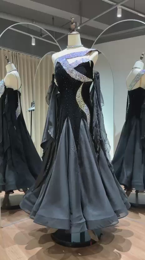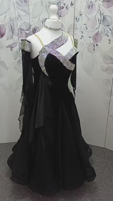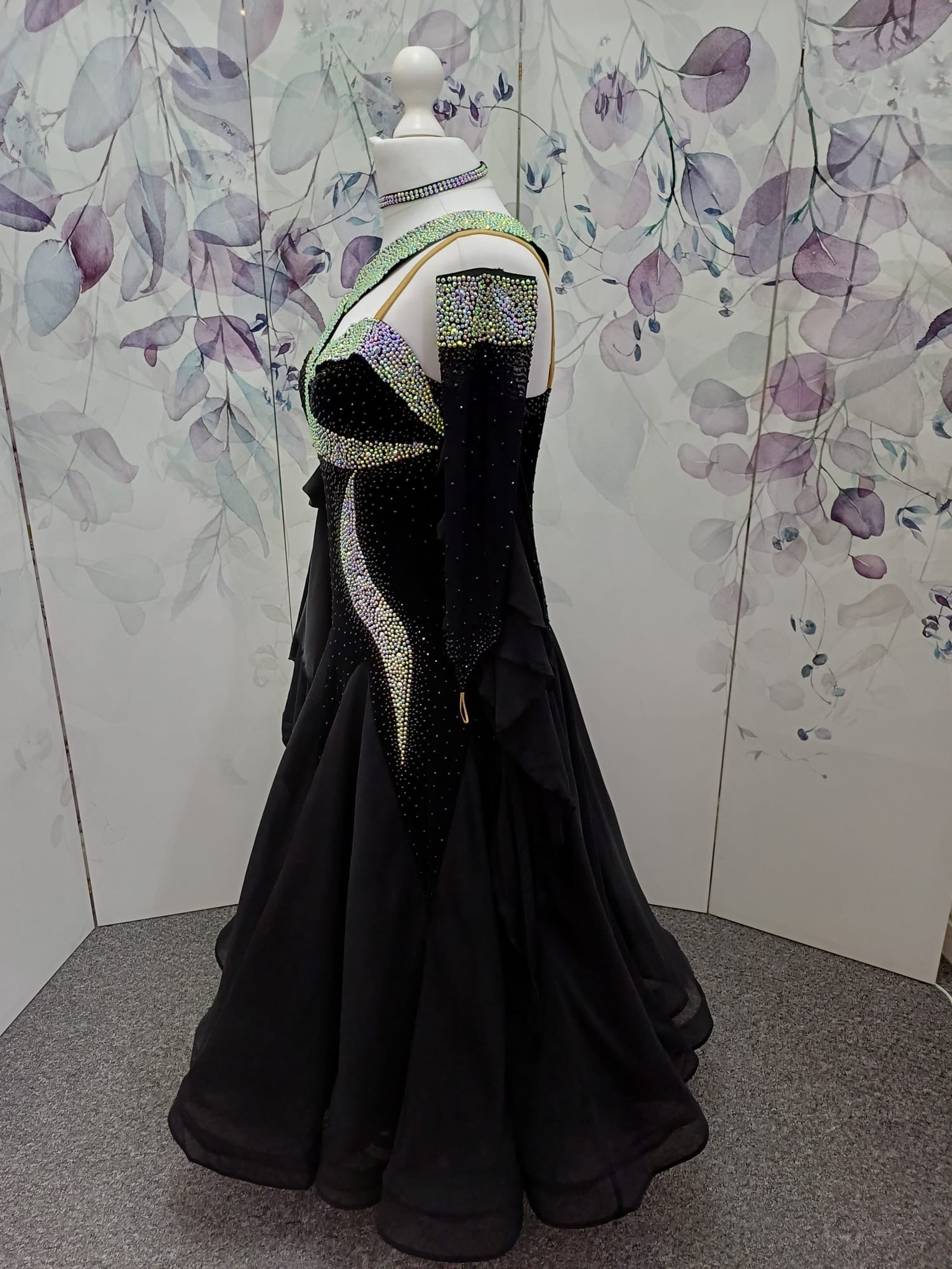 64B Classic Black Competition Ballroom dance dress. Flattering design heavily stoned in AB & Jet. Detachable floats. Satin frill to the front right bodice. Back high enough to wear own bra.