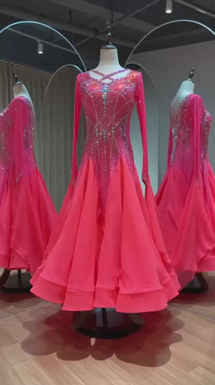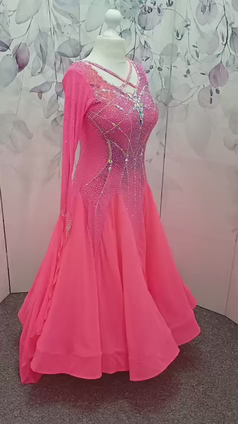66B Coral Competition Ballroom Dance Dress. Striking decoration in AB, Coral & Coral AB. Strappy detail to upper chest & back. High back for option to wear own Bra. Detachable Floats ❤️Showroom Appointments Available❤️