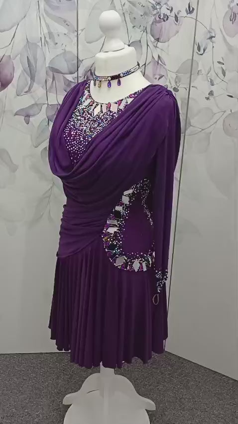 66L Plum Competition Latin Dance Dress. Heavily stoned with AB, Amethyst & Amethyst AB with mirrors. Sash detail to front, back & hip. Could be removed. High back to wear own Bra. ❤️Showroom Appointments Available❤️