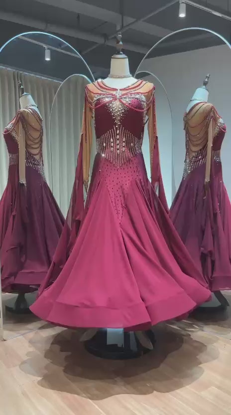 69B TWD ELITE Competition Ballroom/Sequence Dance Dress. Stunning bead detailing to upper chest, shoulders & back. Detachable floats. Stoned in Wine & Crystal Golden Shadow. High back to wear own bra option. ❤️Showroom Appointments Available❤️
