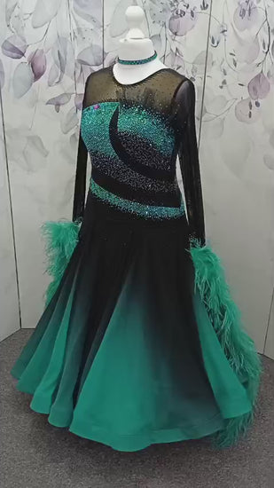 70B Stunning Black & Blue Zircon Competition Ballroom Dance Dress. Heavily stoned in Blue Zircon & jet with detachable Ostrich boa floats. ❤️Showroom Appointments Available❤️
