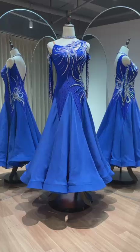 71B Cobalt Blue Competition Ballroom Dance Dress. Heavily decorated in Sapphire & AB. Detachable Ostrich Feather floats. ❤️Showroom Appointments Available❤️
