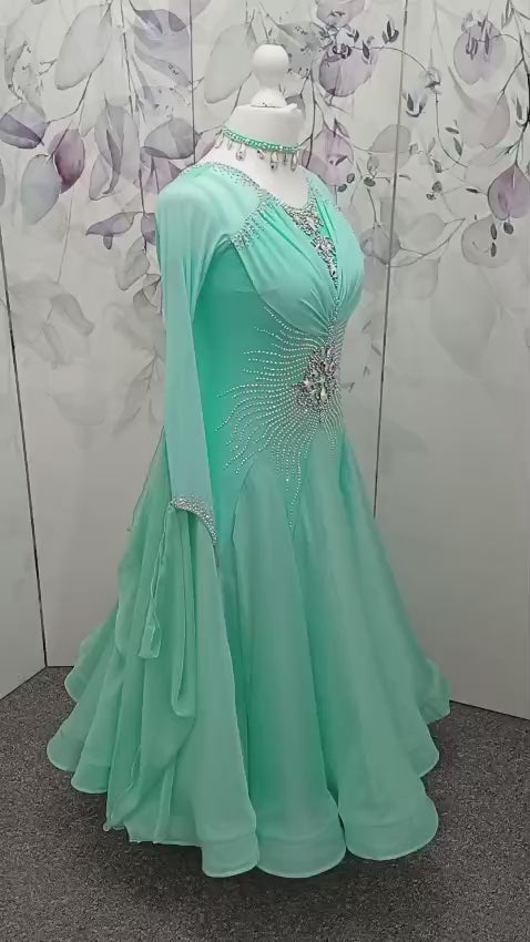 73B Pretty Mint Green Competition Ballroom Dance Dress. Stoned in AB with mesh overlay to the upper chest. Detachable Floats. ❤️Showroom Appointments Available❤️