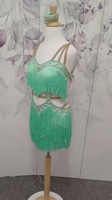 (BUDGET)2 Green Latin Competition Dance Dress. Full Fringed Skirts with shoulder & waist detailing. 2 Bangles included. *****Our New Budget Range are Bought in ready made Costumes, with some detail added by TWDance*****