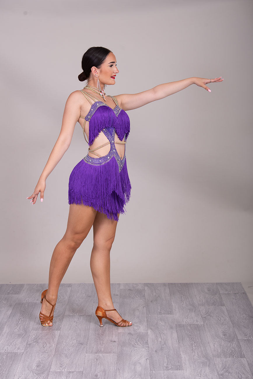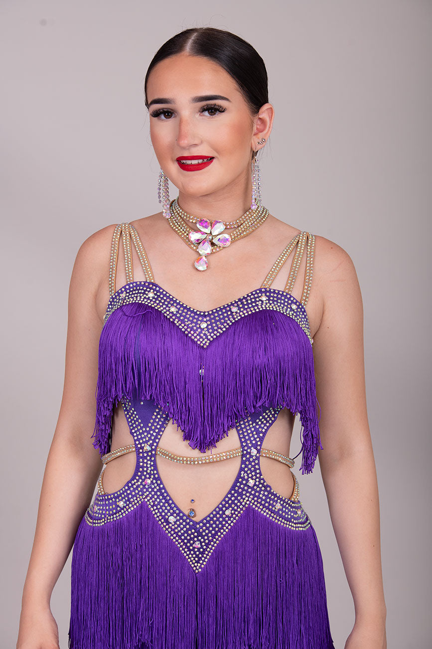 (BUDGET)16Purple Latin Competition Dance Dress.Full Fringed Skirts with shoulder & waist detailing.2 Bangles included. *****Our New Budget Range are Bought in ready made Costumes, with some detail added by TWDance*****