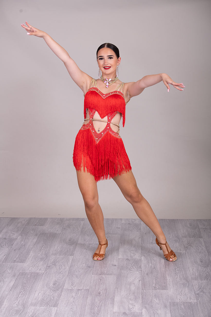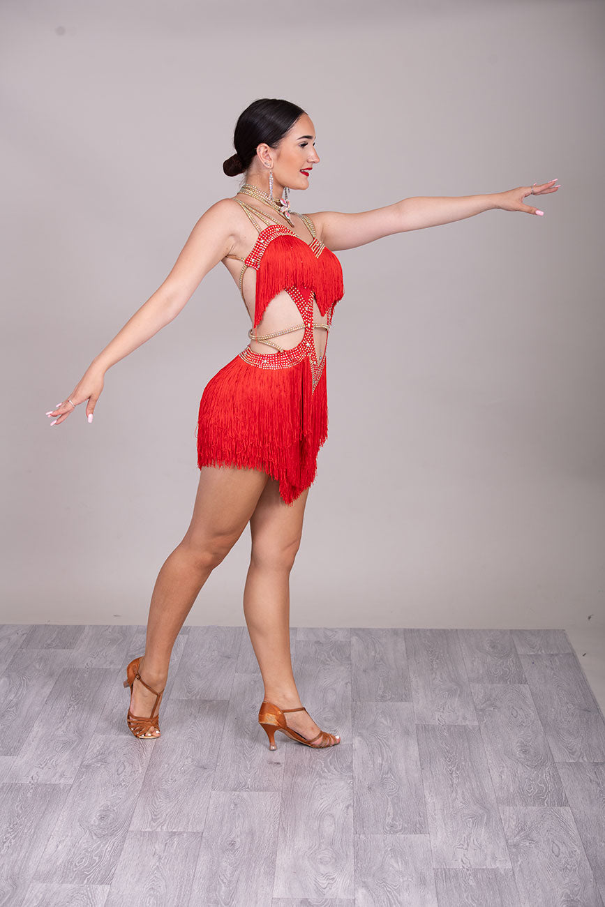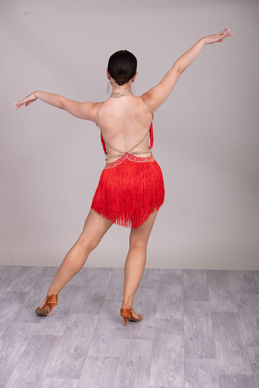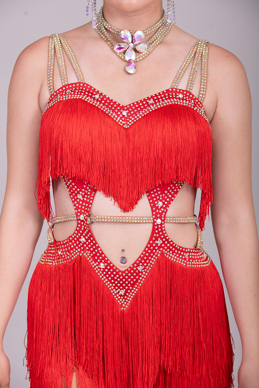 (BUDGET)17 Red Latin Competition Dance Dress.Full Fringed Skirts with shoulder & waist detailing.2 Bangles included. *****Our New Budget Range are Bought in ready made Costumes, with some detail added by TWDance*****