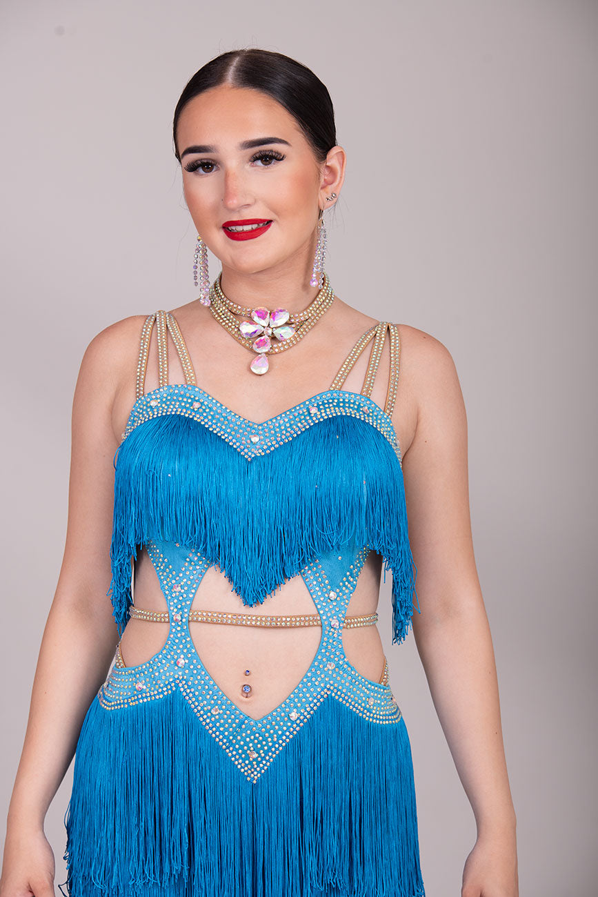 (BUDGET)18 Blue Latin Competition Dance Dress.Full Fringed Skirts with shoulder & waist detailing.2 Bangles included. *****Our New Budget Range are Bought in ready made Costumes, with some detail added by TWDance*****