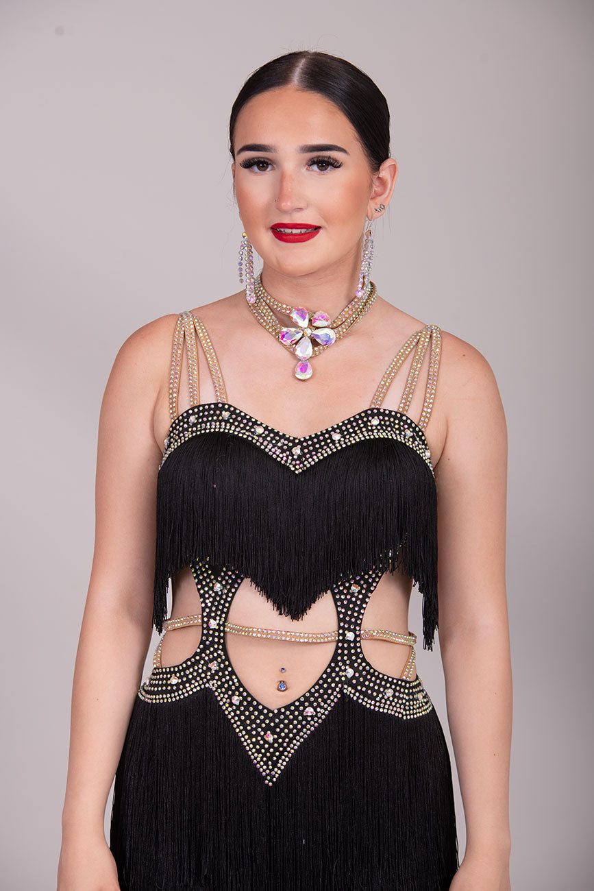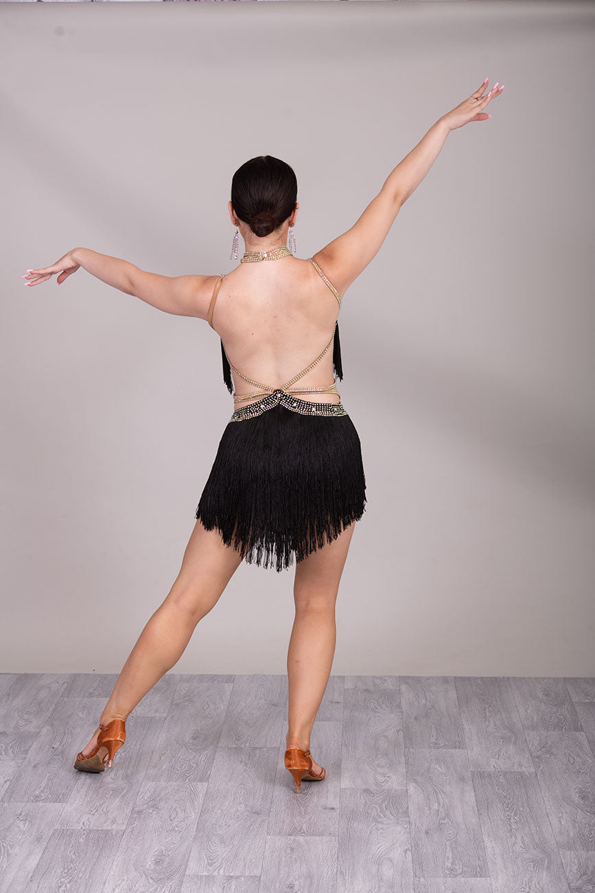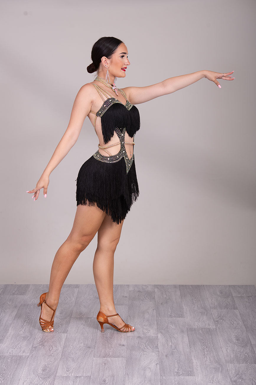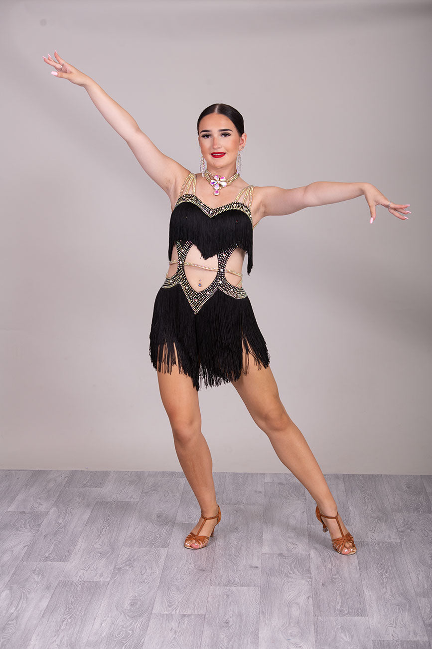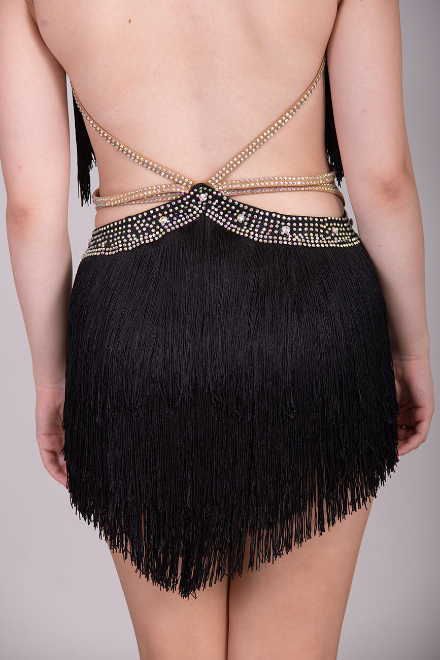 (BUDGET)19 Black Latin Competition Dance Dress.Full Fringed Skirts with shoulder & waist detailing.2 Bangles included. *****Our New Budget Range are Bought in ready made Costumes, with some detail added by TWDance*****