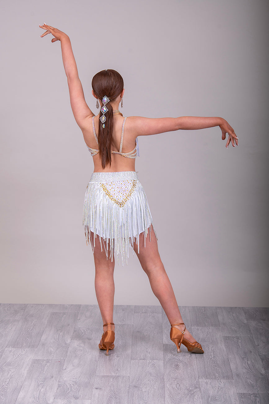 (BUDGET)4 White 2 Piece Latin Competition Dance Dress. AB & Sunshine. Fabric strips skirt in AB Comes with Necklace *****Our New Budget Range are Bought in ready made Costumes, with some detail added by TWDance*****