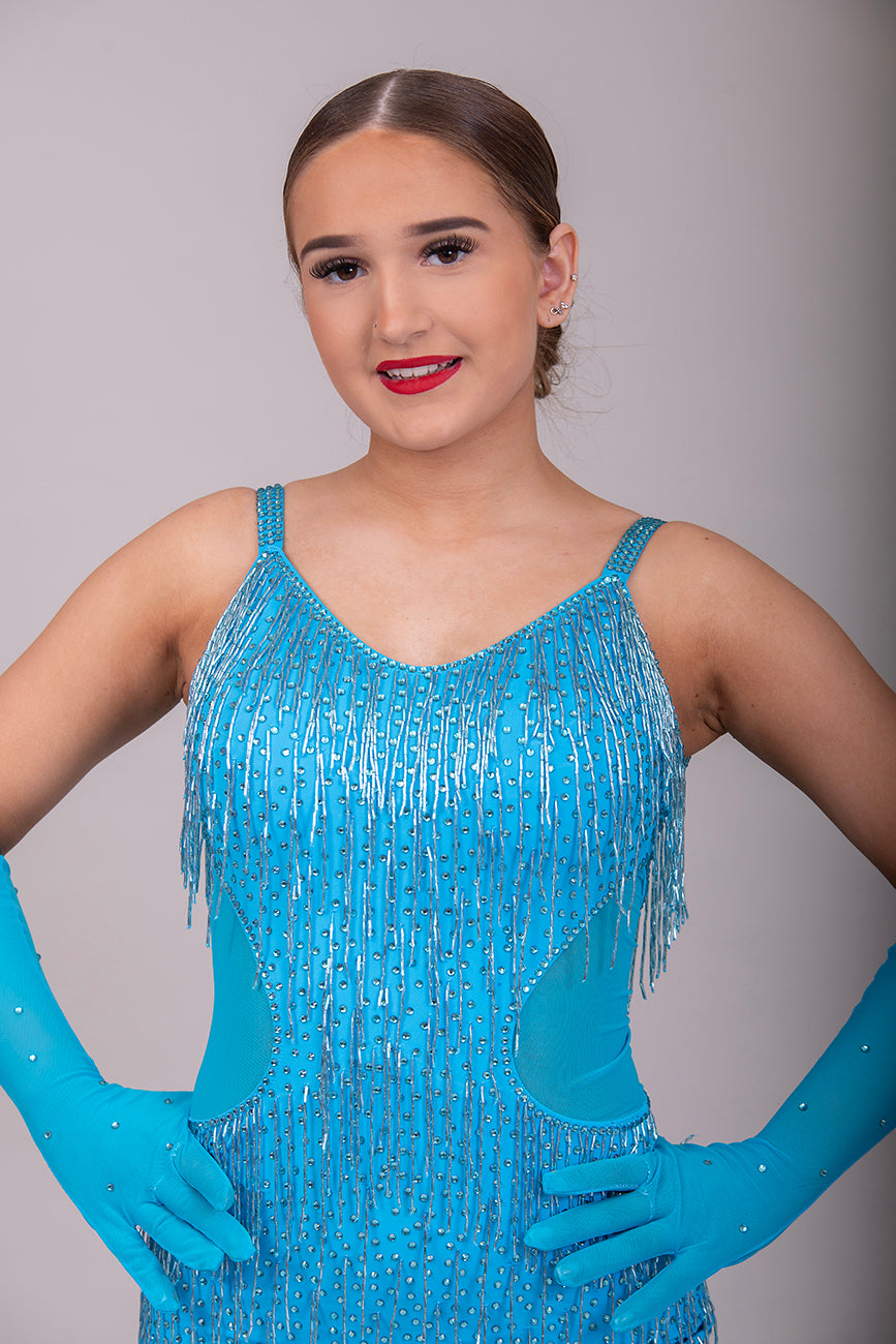 (BUDGET)6 Turquoise Latin Competition Dance Dress. Bead Droppers & stones. Comes with long finger gloves *****Our New Budget Range are Bought in ready made Costumes, with some detail added by TWDance*****