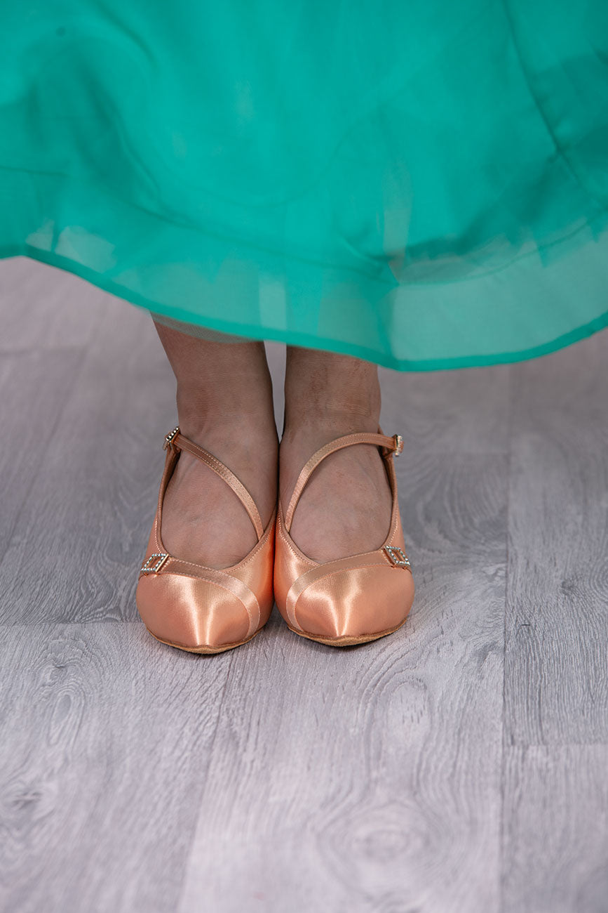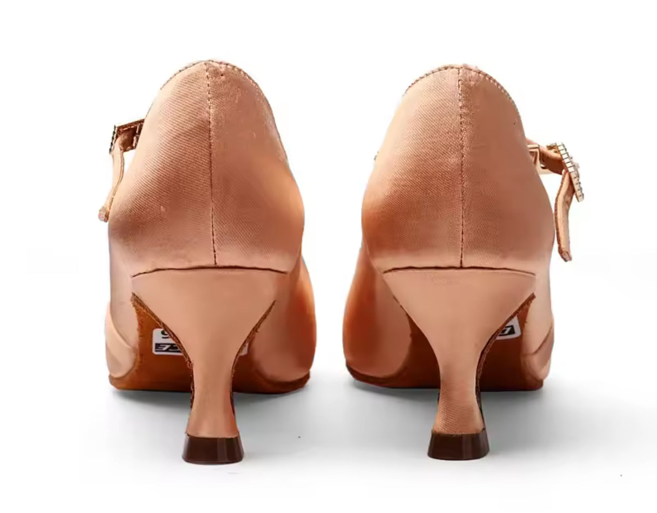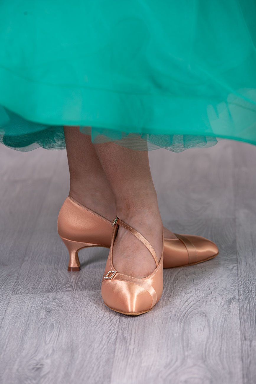 (11) TWD “LULAH” Ballroom Shoes. Flesh Skin Satin with 5.5cm Heel Diamanté Strap & Buckle. Shoes come Boxed Includes a “Black Shoe Bag” pair of plastic feet protectors to try Shoes on for Size, Fit & Comfort.