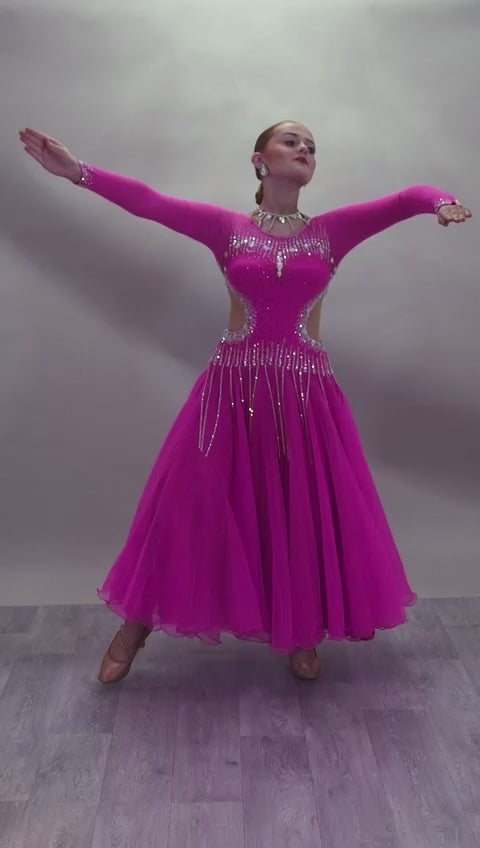00002 Fuchsia Pink flesh side panel Ballroom Dress. AB stoned material droppers from the waist stoned with Ab throughout