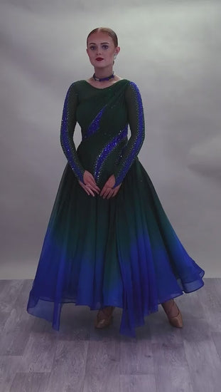 51B TWD “PETITE” Green & Royal Ombre Competition Ballroom Dance Dress. Diagonal Design detail to the Bodice. Stoning in Sapphire & Emerald. ❤️Showroom Appointments Available❤️