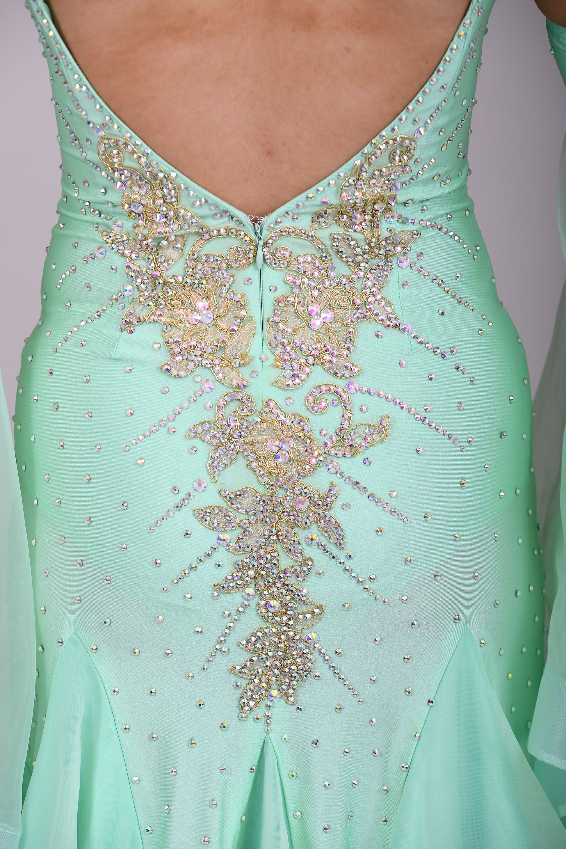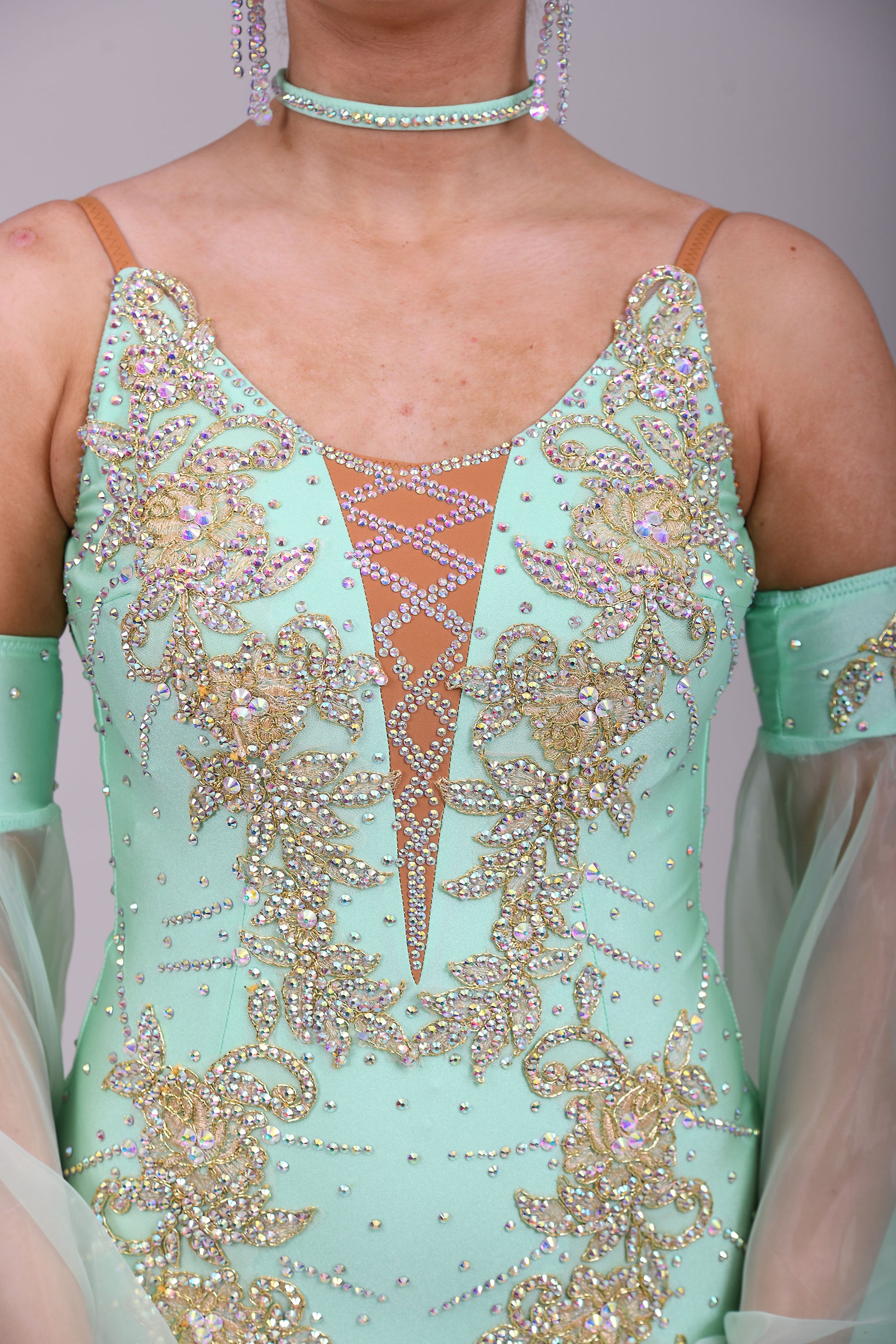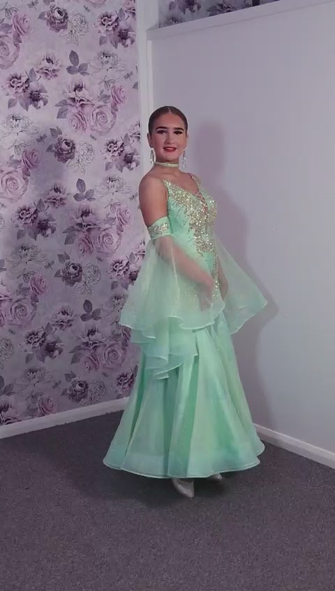 327 mint Green & Gold Ballroom Dress. Decorated with Gold motifs & AB Stones. Comes with separate floaty sleeve cuffs.