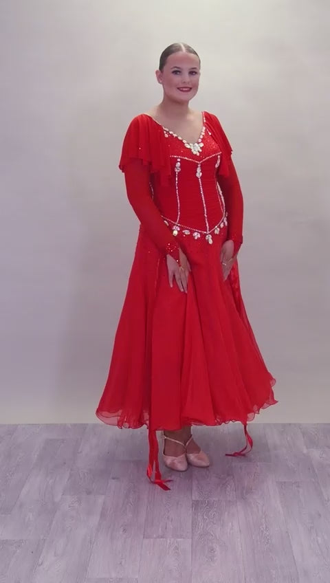 340 Red Rouched Bodice Ballroom Dress. Frill detail to top of sleeve with detachable ribbon floats. Detailed necklace. Decorated in Siam and AB stones.