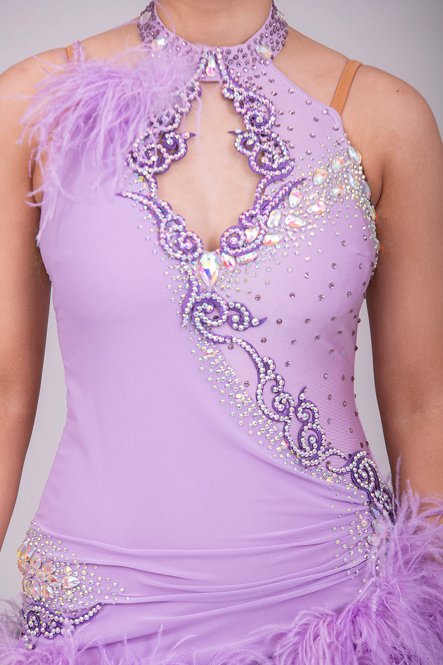 344 Lilac Latin Dress with keyhole halter neck detail. Strapping design on back. Lilac ostrich feather boa skirt. Decorated with purple motif. Stoned in green & AB Boa is hand stitched so could be rearranged